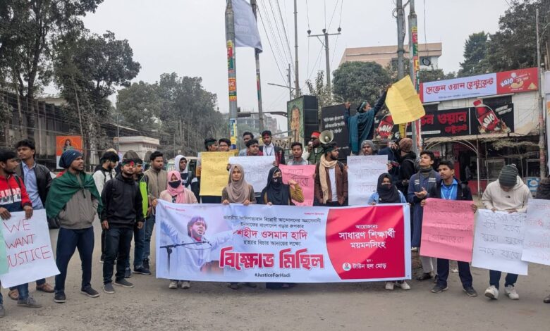 ময়মনসিংহে হাদি হত্যার বিচারের দাবীতে শিক্ষার্থীদের মানববন্ধন